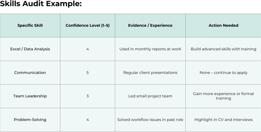 It can be hard to picture what a skills audit looks like until you’ve seen one written out. Below is a short example that shows how someone might record their skills, confidence level, and next steps.