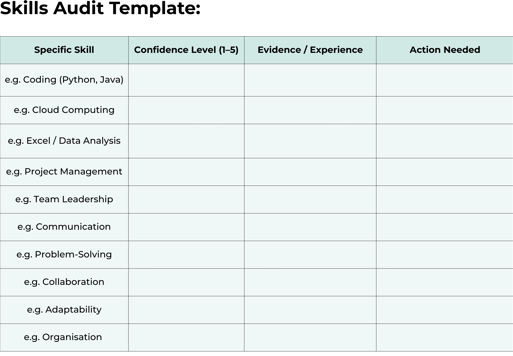 Now it’s your turn. Use this blank template to record your own skills. We’d recommend adding 8–12 skills at first, spread across technical, transferable, and personal qualities.